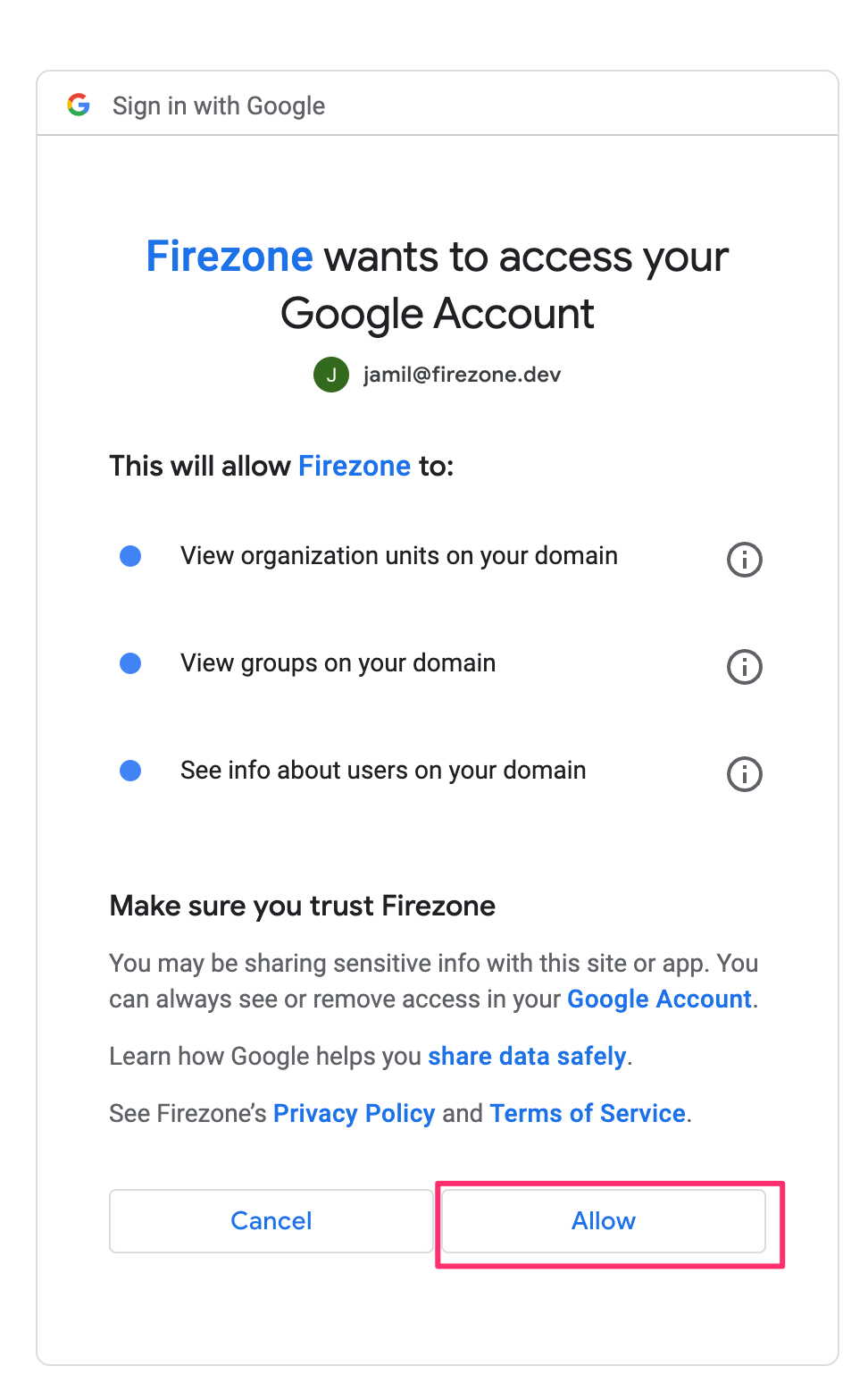 This is used to allow Firezone to read users, groups and organizational units from your Google Workspace account.