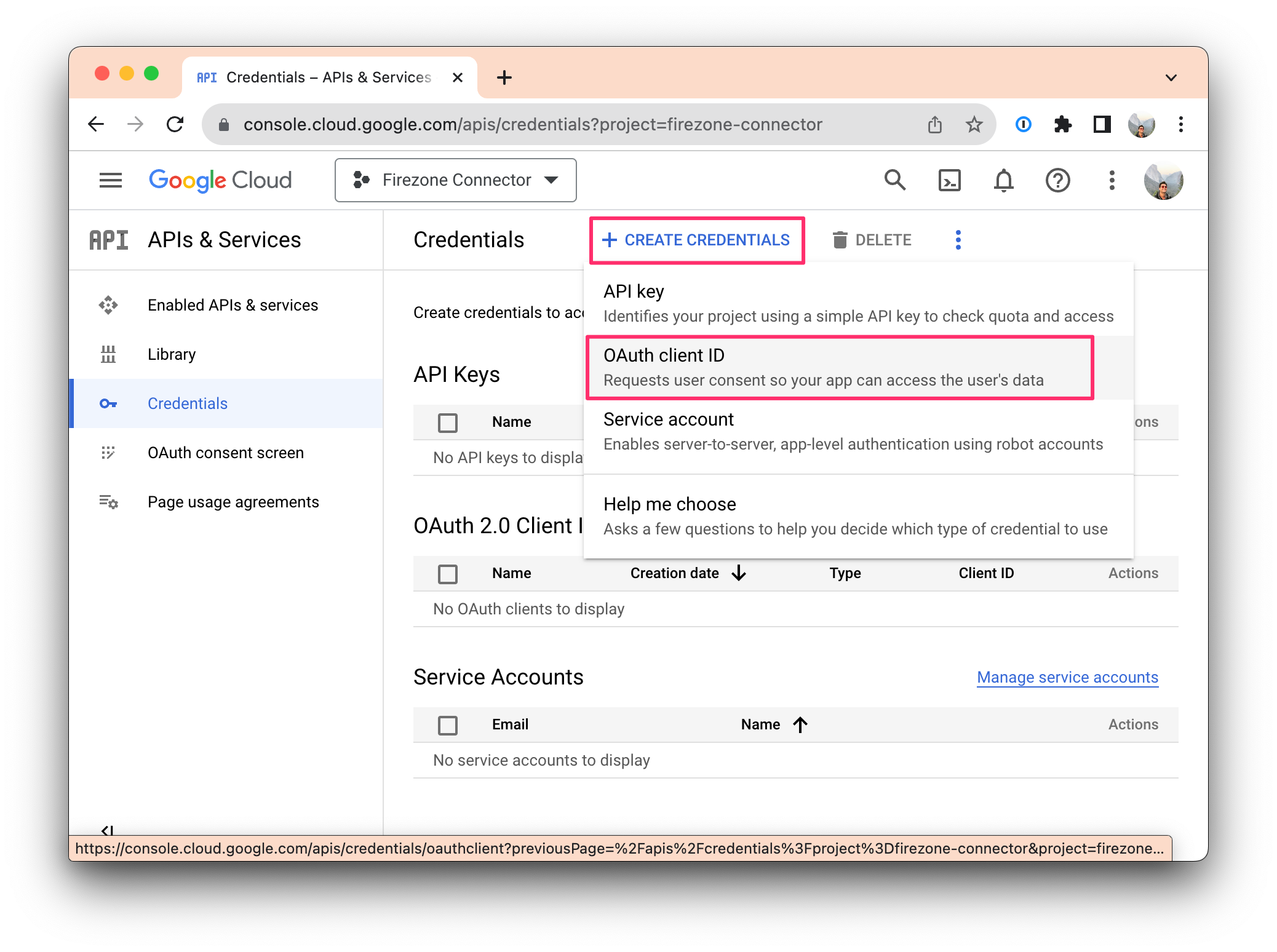 Next, you'll need to add OAuth credentials to allow Firezone to connect to your Google Workspace account.