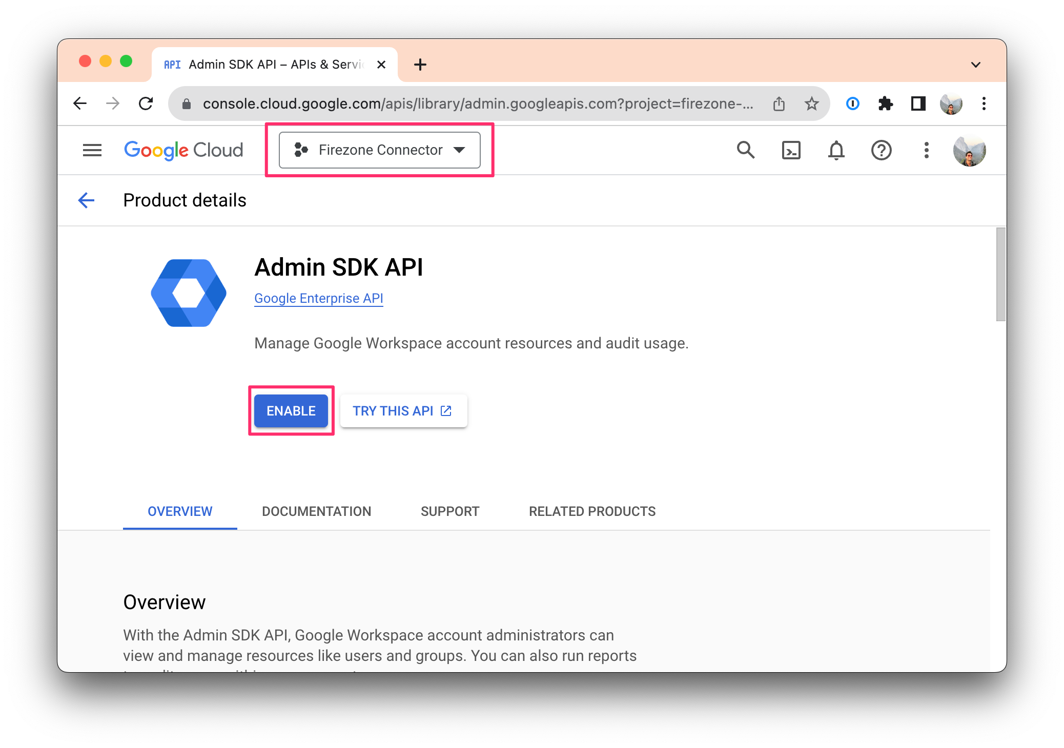 Important: Ensure the Firezone Connector project you created in Step 1 is selected before clicking the "ENABLE" button.