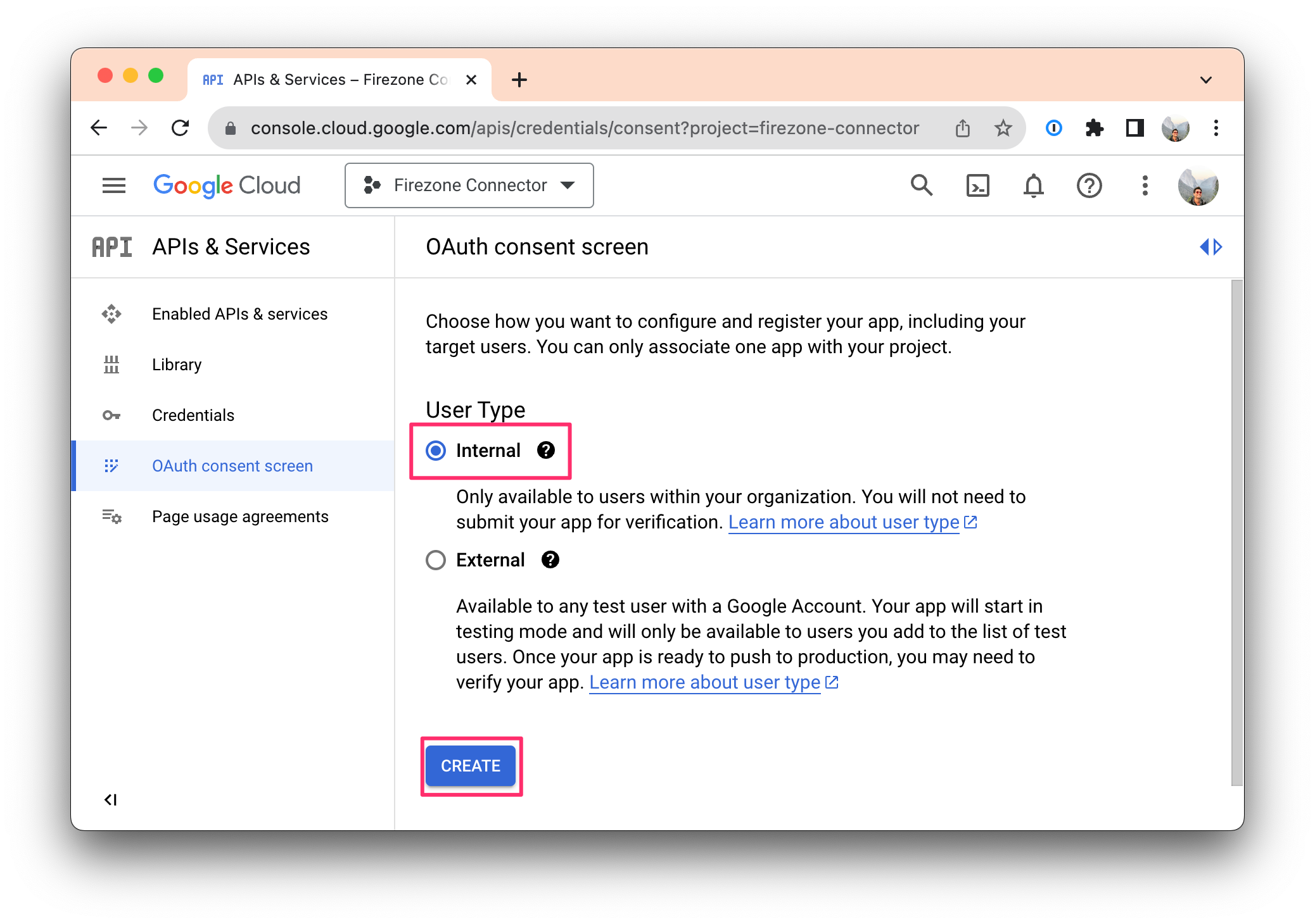 Important: Select "Internal" for User type. Select "External" may allow external users to login to your Firezone account.