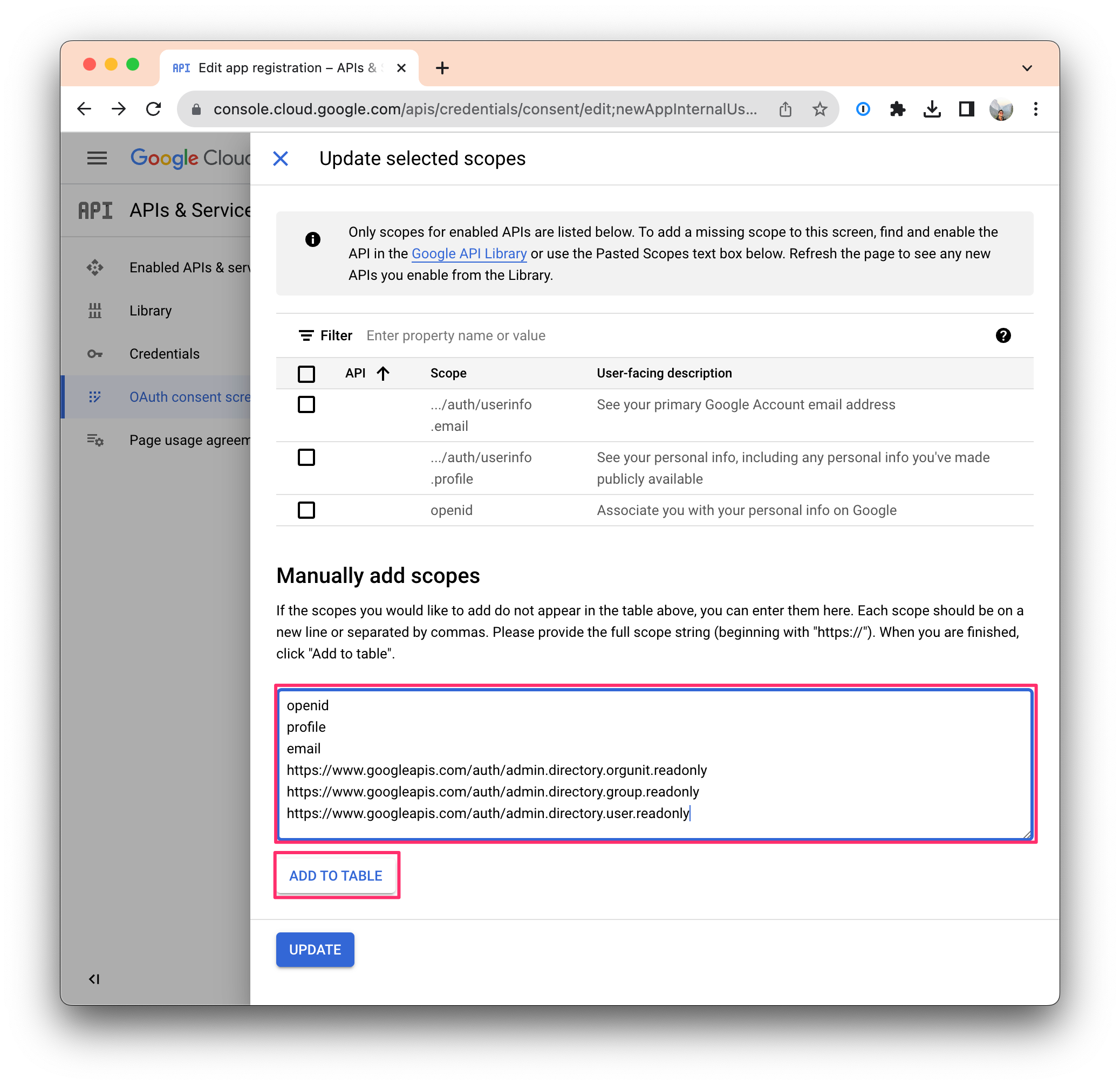 If you're on the Enterprise plan, you'll need to add the following additional scopes to sync users, groups, and organizational units: