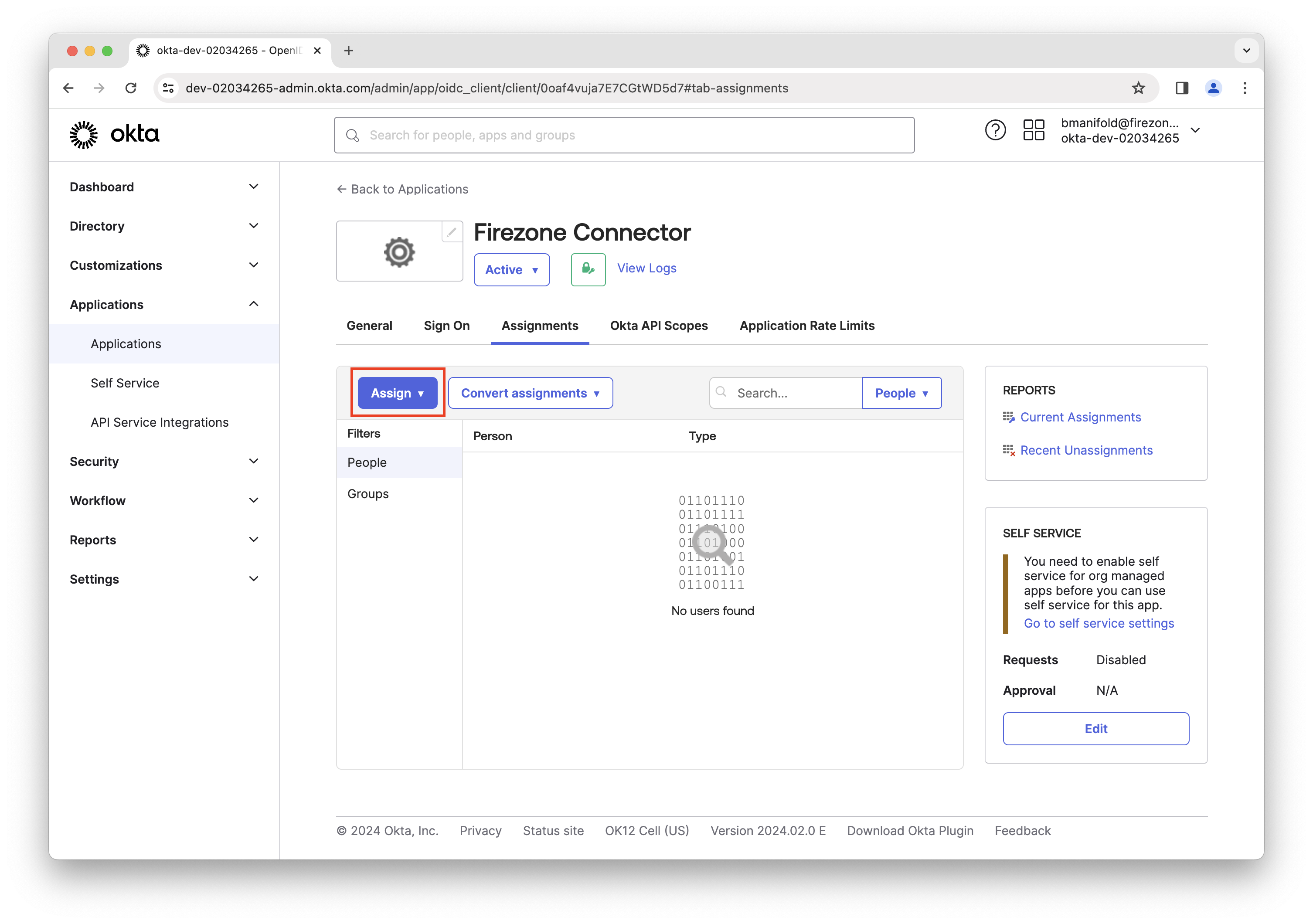 In the app integration settings in Okta, click Assignments and then the Assign button.